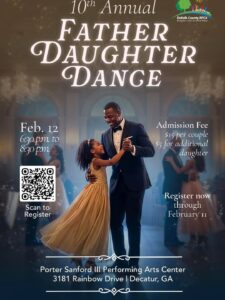 $15.00Dads are invited to bring their daughter(s) to our 10th Annual Father Daughter Dance being held at the Porter Sanford III Performing Arts & Community Center, 3181 Rainbow Drive, Decatur, GA 30034.