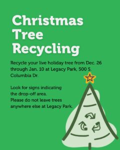 Christmas tree recycling will be available from Fri., Dec. 26 through Sat., Jan. 10 at Decatur Legacy Park, 500 South Columbia Drive.